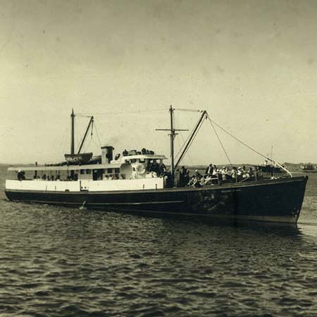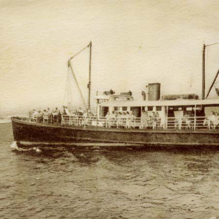 While 2023 celebrates 90 years since the incorporation of Interstate Navigation, the company was operating in a smaller capacity 5 years prior. Founded in 1928 by Capt. Raymond H. Abell, the company started with only one ship. A fully wooden vessel, called the ELIZABETH ANN, started its life as a US Navy submarine chaser in Italy during WWI. When the company acquired it from the government, two chevrons and a star were painted on its smokestack to celebrate its naval service. The ship capacity was 100 passengers and some light cargo.